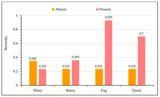 Figure 5 portrays the effect of different weather conditions on crash severity output. It is worth noting that shiny weather conditions are associated with non-fatal crashes. During clear weather, drivers usually have a good sight of the roadway ahead during travel. Furthermore, they are more aware of adjacent vehicles and can detect the danger from a long distance, which gives them ample reaction time to control their vehicles. Thus, shiny weather reduces the prospects of severe crashes [88]. In contrast, the presence of adverse weather conditions such as rainy weather, fog, dusty conditions (mostly due to sand storms) all increases the likelihood of fatal crashes. High probability of fatal crashes during rainy weather conditions may be attributed to retarded visibility and loss of friction and pavement skid resistance [89,90]. Similarly, during foggy weather conditions, the driver’s sight is severely hampered, at times limiting the vision to only a few meters ahead. Drivers are unable to detect the nearby threat, and chances of fatalities are very high, even if vehicles are maintaining average traveling speeds since drivers do not have enough time to compensate. Sand storms are other prominent causes of fatal crashes throughout the KSA as they occur at different times of the year. During such weather conditions, the atmosphere is filled with dust and sand particles lasting from a few days to weeks, imparting poor visibility. These observations are in agreement with existing research. Several previous studies have reported that the presence of adverse weather conditions increases the injury severity of traffic crashes [89,91,92].