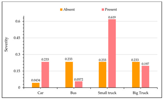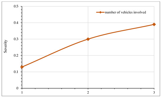 In Figure 6, sensitivity analysis for crash injury severity based on the type of vehicle involved is shown. It is evident from the figure that the presence of a car and a small truck is associated with an increased likelihood of fatal crashes. In particular, the probability of a fatal crash is increased by approximately 40% in collisions involving small trucks. This observation may be attributed to a severe impact due to the relatively high speeds of these vehicles. The literature suggests that high speed is an undeniable factor for greater kinetic energy release during motor vehicle collisions [93,94]. It is interesting to note that collisions involving buses and big trucks reduce the odds of fatal crashes. This perception is reasonable first because the average travel speed for buses and big trucks are relatively low, and second, these vehicles are structurally well-built and can absorb a significant amount of energy during the impact. Therefore, the chances of severe injuries are relatively less. These findings are consistent with the previous literature [95]. However, few studies have also reported that prospects for severe injuries are aggravated in crashes involving buses and trucks [49,96,97]. Figure 7 presents the relationship between crash injury severity and the total number of vehicles involved. It is clear that as the number of vehicles involved increases, there is a greater probability of a crash, resulting in a fatality. Earlier studies also suggest that multi-vehicle collisions are usually more prone to severe crashes [95,98,99].