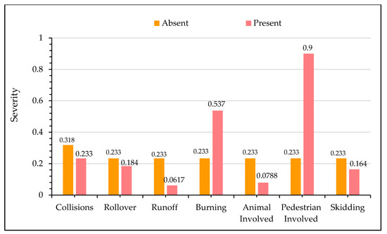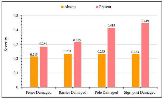Figure 9 presents the sensitivity analysis for crash injury severity with on-site damaged conditions from crash locations. The presence of damage on the flexible barrier and fence is a hint of the slight increase in the likelihood of fatal crashes. The presence of a fence and side barrier dissipates and absorbs some of the energy of the errant vehicle and usually diverts it back to the highway. In comparison, the damage on signposts and poles are significant indicators of fatal crashes. Signposts and poles are usually located far from the main carriageway; thus, the presence of damage on them implies that either the vehicles were traveling at very high speeds or the driver fell asleep due to fatigue. Second, the structures of signposts and poles are very rigid and cannot absorb the kinetic energy upon impact, unlike flexible roadside barriers and fences.