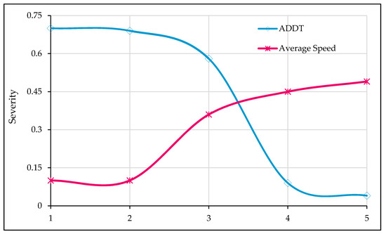 In Figure 10, the influence of traffic characteristics (AADT, and average stream speed) on crash injury severity is shown. The numeric values (1–5) for ADDT and average speeds shown on the x-axis represent the respective categories given in Table 1 (descriptive statistics). It may be noted from the figure that increasing AADT values are associated with non-fatal crashes. In contrast, high traveling speeds are indicators of fatal injury. Both these observations are intuitive and are in-line with the existing literature [86]. An increase in traffic reduces the drivers’ freedom to drive at free flow since their movement is restrained by other vehicles, who are bound to adjust their vehicle speeds. Furthermore, when ADDT is high, the drivers are more aware and alert to surrounding traffic. Many previous studies have established the association between high traveling speed and fatal crashes [93,104,105].