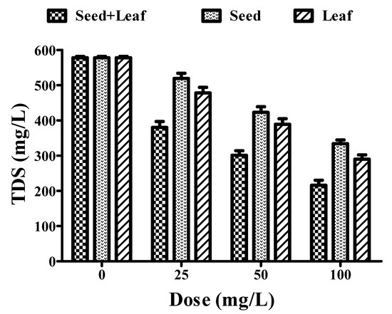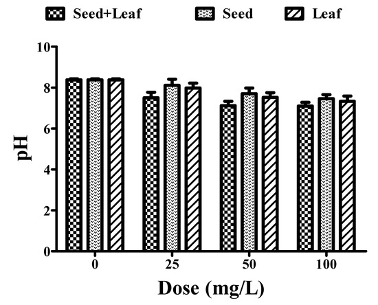 The permissible limit of pH lies in the range of 7–8 for drinking water [23]. Treatment of water samples with the individual leaf and seed extracts of Moringa oleifera led to a remarkable change in pH in a dose-dependent manner. However, the combined extracts showed better efficacy in the pH reduction (8.38 to 7.10) than the individual extracts of seeds (8.38 to 7.46) and leaves (8.38 to 7.33) (Figure 1, Table 1). Therefore, these experimental findings clearly indicate that the combined extract has a greater potential for pH reduction in comparison to the individual seed and leaf extracts of Moringa oleifera, and should thus be further utilized for water purification.