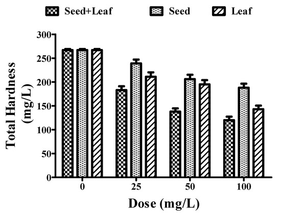 The combined extract of the Moringa oleifera plant led to a more prominent decrease in the total hardness of the groundwater sample (Figure 3, Table 1) in comparison with the individual seed and leaf extracts. It can be seen in Figure 3 that there was a significant change in the total hardness of the water sample treated with the combined extract (267 to 120 mg/L) at a concentration of 25–100 mg/L. Additionally, individual treatments with the leaf extract (267 to 143 mg/L) showed a better potential than the seed extract (267 to 188 mg/L) at a dose of 0, 25, 50, and 100 mg/L.