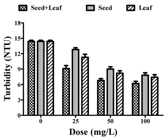 The turbidity of groundwater samples treated with the individual extracts of seeds (14.4 to 7.8 NTU) and leaves (14.4 to 7.4 NTU) of Moringa oleifera at a dose range of 25–100 mg/L was reduced in a dose-dependent manner (Figure 4, Table 1). However, treatment with the combined extract (14.4 to 6.20 NTU) led to a more prominent reduction in the turbidity at a similar dose range of 25–100 mg/L for the individual seed and leaf extracts of the Moringa oleifera plant, thereby revealing a better turbidity removal efficiency of the combined extract.