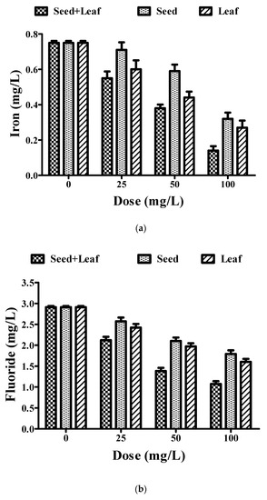 Comparative experimental analysis of combined (seed and leaf) and individual extracts of Moringa oleifera plant on metallic impurity parameters such as (a) iron and (b) fluoride in groundwater at different doses (25–100 mg/L). Experiments were done three times in triplicates and presented as mean ± SEM.