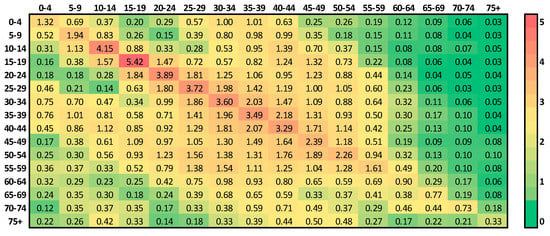 | Number of contacts made by an individual in age group with individuals in age group | Figure 3 | [25] | |