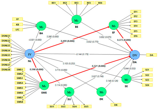 Bootstrapping result for mediation analysis (5000 resamples and 2-tailed). The figure shows the hypothesised mediation paths connecting nutrition literacy to dietary adherence in HD patients. Significant mediation paths are highlighted by red bold lines. Data are presented as path coefficient for the direct effect (p-value); NL: Nutrition literacy; DK: Dietary knowledge; BE: Perceived benefit; FP: Food preference; KB: Knowledge barrier; LFC: Limited food choices; BA: Perceived barrier; SE: Perceived seriousness; SU: Perceived susceptibility; EF: Perceived self-efficacy; SMS: Self-management skills; DA: Dietary adherence; IV: Independent variable; DV: Dependent variable; M: Mediator.