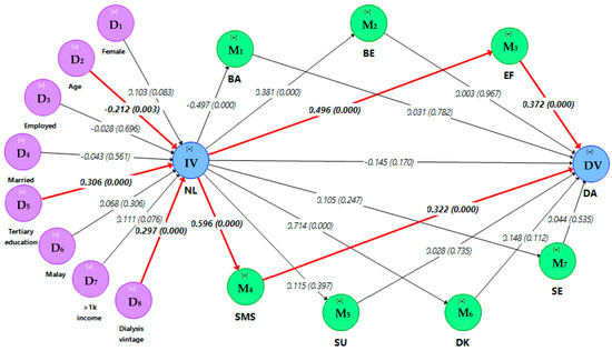 Bootstrapping result for serial mediation analysis (5000 resamples and 2-tailed). The figure shows the full relationship continuum from sociodemographic factors and dialysis vintage to nutrition literacy, patient-related factors and finally dietary adherence in HD patients. Significant mediation paths are highlighted by red bold lines. Data are presented as path coefficient for the direct effect (p-value); NL: Nutrition literacy; DK: Dietary knowledge; BE: Perceived benefit; BA: Perceived barrier; SE: Perceived seriousness; SU: Perceived susceptibility; EF: Perceived self-efficacy; SMS: Self-management skills; DA: Dietary adherence; IV: Independent variable; DV: Dependent variable; M: Mediator; D: Determinants.