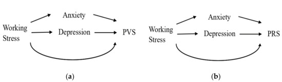 (a) Causal relationship among working stress during medical internship, anxiety, depression, and phantom vibration syndrome (PVS); (b) Causal relationship among duty stress, anxiety, depression, and phantom ringing syndrome (PRS).