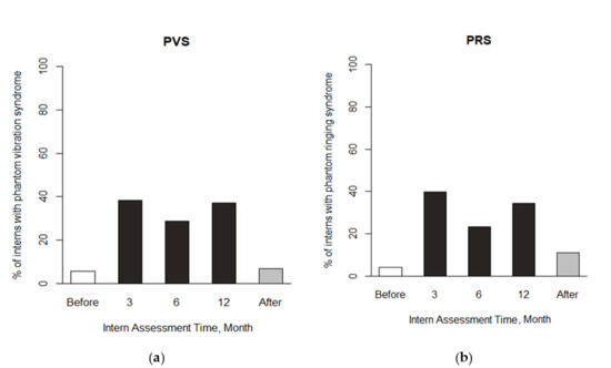 (a) The proportion of interns who reported clinical phantom vibration syndrome (PVS) before and after the internship and at the 3rd, 6th, and 12th months during the internship. (b) The proportion of interns who reported clinical phantom ringing syndrome (PRS) before and after the internship and at the 3rd, 6th, and 12th months during the internship.