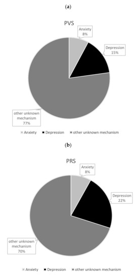 (a) Proportion of stress-induced phantom vibration syndrome (PVS) explained by the change of depression and anxiety score. (b) Proportion of stress-induced phantom ringing syndrome (PRS) explained by the change of depression and anxiety score.