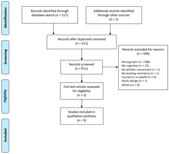 Two independent investigators (Jan Wilke and Florian Giesche) performed a systematic literature search. In a first step, relevant articles, published without date restrictions, were identified by means of the online databases MEDLINE (PubMed) and ScienceDirect. The search term used was “(neurocognition OR cognition) AND (unanticipated OR unplanned OR choice-reaction) AND (cutting OR landing)”. In addition, the reference lists of all papers relevant to the research question were checked [14]. As the omission of unpublished data has been shown to potentially bias the results of reviews [15], additional searches were performed with Google Scholar, screening the first 100 hits obtained with the above term.