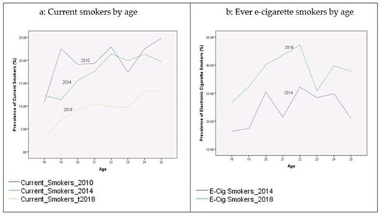 The past decade has witnessed rapidly changing patterns of tobacco use among youth and young adults. According to the U.S. Surgeon General [7], e-cigarettes have emerged as the most frequently used tobacco product among youth in the United States in 2014, surpassing conventional cigarettes. E-cigarettes are new forms of tobacco products that contain nicotine and users consume it via an inhaled aerosol. The e-cigarette market has produced a rapidly emerging and diversified product class with several interchangeable names, “e-cigs”, “e-hookahs”, “mods”, “vape pens”, “vapes”, and “tank systems”. Research findings based on adult samples have indicated that delivery of nicotine doses from e-cigarettes can be as large as or larger than conventional cigarettes [8,9]. A group of experts of the National Academies of Sciences, Engineering, and Medicine (2018) released a report to summarize the public health consequences of e-cigarettes [10]. There were forty-seven major conclusions, including eight pieces of conclusive evidence, ten of substantial evidence, eight of moderate evidence, twelve of limited evidence, four of insufficient evidence, and five with no available evidence in terms of diseases and harm related to e-cigarettes. In addition, there are few studies on the health effects of long-term use of e-cigarettes or the association between use of e-cigarettes and cigarette smoking [11]. Given the relatively new introduction of e-cigarettes, new scientific evidence of their health effects continues to emerge. This study fills a gap by examining the associations between previous e-cigarette consumption and current cigarette smoking among youth and young people. The purpose of this study was three-fold: (a) to estimate the prevalence rates of cigarette and e-cigarette smoking among different demographic and socioeconomic groups among young adults aged 18 to 25 years, (b) to estimate socioeconomic disparities in smoking, and (c) to determine the relationship between previous e-cigarette use and current cigarette smoking.