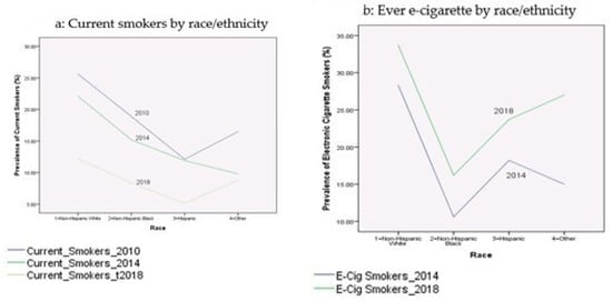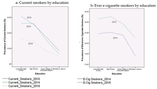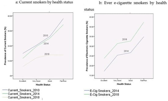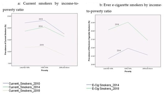 Table 2 presents the prevalence rates of current cigarette smokers and electronic cigarette smokers among youth during the period 2010–2018. These proportions were broken down by age, gender, race/ethnicity, education, income-to-poverty ratio, reported health status, and citizenship status. Figure 1, Figure 2, Figure 3, Figure 4 and Figure 5 depict these trends in terms of line graphs. The trends were consistent across different sociodemographic indicators. Specifically speaking, the prevalence rates of cigarette smoking declined in the past decade with the prevalence rate highest in 2010 and lowest in 2018. In a sharp contrast, electronic cigarette smokers increased from 2014 to 2018.