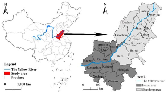 Based on the natural division, the lower reaches of the Yellow River, with a length of 785.6 km, can be divided from Taohuayu to Lijin County [43]. Because the close relationship between regional economic development in the lower reaches of the Yellow River and the integrity of administrative divisions at the prefectural level, the areas covered by the irrigation areas in the lower reaches of the Yellow River are merged into the study area [41,44] (see Figure 1). Laiwu City in Shandong Province was merged with Jinan City in 2019, forming the Laiwu District. However, because the research period of this study is 2007–2018, Laiwu City was still considered as an independent prefecture-level city. By 2018, the GDP in the study area reached 6.63 trillion yuan, accounting for more than 40% of the total GDP of the whole basin, while the average level of urbanization and urbanization level of key cities reached >57% and >70%, respectively. In 2019, the ecological protection and high-quality development of the Yellow River Basin became national strategies that provided strategic opportunities for the coordinated development of the regional economy as a unit [45]. Therefore, it is urgent to study the spatiotemporal differences of the urban eco-efficiency in traditional farming areas in the lower reaches of the Yellow River and to analyze the influencing factors in order to provide relevant policy suggestions for the study of regional urban sustainable development.