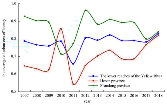 During the study period, the average urban eco-efficiency in the lower reaches of the Yellow River steadily increased, except for the period of 2010–2012. In 2011, the eco-efficiency of the study area was at the lowest level in the study period, and began to rebound in 2012, mainly due to the implementation of the Twelfth five-year plan for the prevention and control of air pollution in key areas in 2012, which strengthened the efforts of environmental protection and control. The urban eco-efficiency in the lower reaches of the Yellow River in Shandong Province shows an overall “decline–rise–decline” trend, while the urban eco-efficiency in the lower reaches of the Yellow River in Henan Province fluctuated in the early stage and steadily increased in the later stage. From a phased point of view, the eco-efficiencies of the cities in the lower reaches of the Yellow River showed a downward trend in the early stage of the study period (2007–2009), mainly due to the government increasing infrastructure investments and vigorously promoting the development of the economy to slow down the impact of the global economic crisis. This led to inefficient economic development and serious environmental pollution. In the middle of the research period (2009–2014), the urban eco-efficiency in the lower reaches of the Yellow River significantly fluctuated. The urban eco-efficiency in Shandong Province first declined, then rose, and then declined. The urban eco-efficiency in Henan Province first increased, then decreased, and finally steadily increased. In the later period of the research period (2014–2018), the gap in the urban eco-efficiencies between the two provinces gradually decreased. In the past two years, the level of the urban eco-efficiency in the lower reaches of the Yellow River in Henan Province has been the same as that in Shandong Province, indicating that the mode of economic development in Henan Province has changed since 2011 and the efficiency of economic development has improved on the basis of energy conservation and emission reduction, which greatly improves urban eco-efficiency.