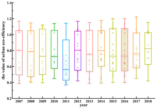 Boxplot of the urban eco-efficiency in the lower reaches of the Yellow River.