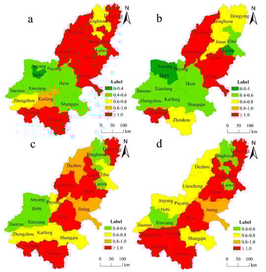The analysis of Figure 4 shows that the level of urban eco-efficiency in the lower reaches of the Yellow River showed a deteriorating trend from 2007 to 2011, showing a trend of improvement from 2015 to 2018. The high-value area showed a “blooming in the middle and developing in the opposite direction at both ends” trend. This means the high value areas of urban eco-efficiency in Henan Province are gradually increasing, while the cities in Shandong Province with high eco-efficiency show a downward trend. In the border area of the two provinces, the urban eco-efficiency also showed improvement. Meanwhile, the urban eco-efficiency in the low-value area gradually decreased. In 2007, the high-value area in the lower reaches of the Yellow River was in Shandong Province, and only Xuchang and Zhoukou in Henan Province exhibited efficiency values greater than 1. The junction of Shandong and Henan provinces has become a low-value agglomeration area with respect to eco-efficiency. Hebi was the city with the lowest eco-efficiency in the study area (Figure 4a). In 2011, areas with low eco-efficiency expanded and the efficiency values of Zhengzhou, Zhoukou, Jinan, Dongying, and Zibo significantly decreased. The eco-efficiency values of Anyang and Laiwu declined below 0.4 (Figure 4b). In 2015, the high-value area rebounded and the area with an eco-efficiency below 0.4 gradually disappeared. The high-value area in Henan Province returned to the state of 2007. Dezhou City in the Shandong Province did not reach an efficient level, but the urban eco-efficiency of Heze City reached the optimum level (Figure 4c). In 2018, the range of areas with low eco-efficiency decreased, areas with high eco-efficiency in Henan Province expanded, and Zibo City in the Shandong Province reached an efficient level, while the eco-efficiency of Liaocheng City decreased (Figure 4d).