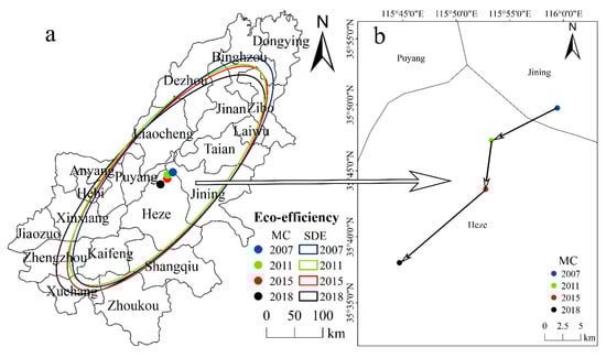 The analysis of the temporal–spatial characteristics of urban eco-efficiency is of great significance to the study of the stage and spatial differentiation characteristics of urban eco-efficiency in the lower reaches of the Yellow River. Therefore, to analyze the spatial evolution of the urban eco-efficiency in the lower reaches of the Yellow River during the research period, we used the SDE model and MC in this study. On the basis of the urban eco-efficiency in the study area in 2007, 2011, 2015, and 2018 and through using ArcGIS10.2 software, we obtained the spatial pattern of the urban eco-efficiency in the lower reaches of the Yellow River (Figure 5a), the MC migration curve of the eco-efficiency (Figure 5b), and quasi-elliptical parameters and changes in the eco-efficiency MC (Table 2).