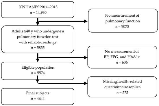 Of the 14,930 individuals who participated in KNHANES 2014–2015, 8626 individuals aged ≥40 years were included in the present study, because spirometry was measured in participants aged 40 years or older. The study exclusion criteria applied were: (1) did not undergo a pulmonary function test (n = 9075); (2) missing BP, fasting plasma glucose (FPG) level, and HbA1c values (n = 636); and (3) missing health-related questionnaire replies (n = 575). Finally, a total of 4644 participants (2120 males and 2524 females) were included in the analysis (Figure 1). All voluntarily engaged participants provided written informed consent prior to their enrollment. The participants’ records, except survey date and home region, were anonymized prior to analysis.