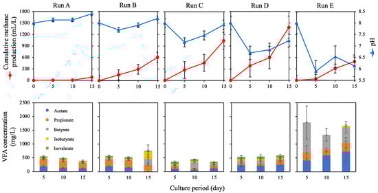 Cumulative methane production and pH changes (upper row), and concentration of VFA (lower row) in the batch cultures with simulant beverage waste mixture (SBWM). The amounts of SBWM added were 0, 0.5, 2, 5, and 10 mL for runs A, B, C, D, and E, respectively. Experiments were performed in triplicate, and error bars represent standard deviations.