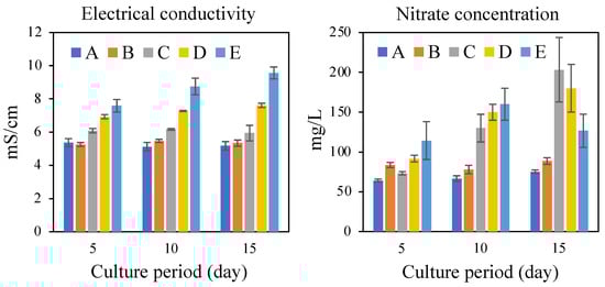 Electrical conductivities (left panel) and concentrations of nitrate (right panel) in runs A, B, C, D, and E. Experiments were performed in triplicate, and error bars represent standard deviations.