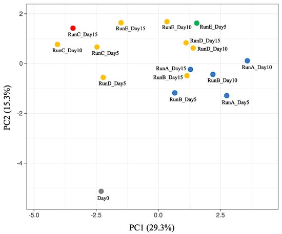 To visualize the differences of community structure, principal component analysis (PCA) and clustering of the taxonomic compositions in the family level were performed, and the results are shown in Figure 3. The plots of the communities in same runs tended to gather together, and the result of clustering demonstrated that the communities in run A and B formed a different cluster from those in other runs. Interestingly, the communities at day 15 in run C and day 5 in run E formed completely independent clusters each (Figure 3). There was a possibility that a depletion at day 15 in run C and an initial excess feeding at day 5 in run E of SBWM nutrients in the cultures would affect the diversities of community.