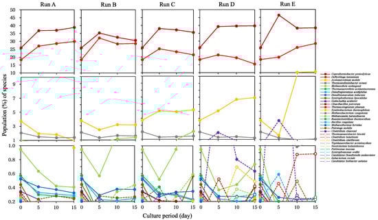 Changes in population of the species in runs A, B, C, D, and E. The species that amounted more than 0.2% population are shown.