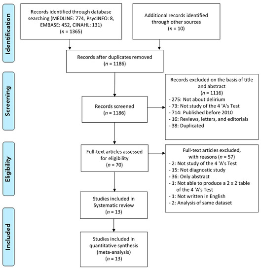 Figure 1 presents the details of the study selection flow. Among 1375 records, we identified a total of 1186 studies after removing duplicated articles. Through the screening of titles and abstracts, we identified 70 potentially relevant articles on the diagnostic performance of the 4AT. Among them, we excluded 57 studies, 2 of which were validation studies of the 4AT using the same dataset with already included studies [23,24]. As a result, a total of 13 articles that met the inclusion criteria were finally identified in our systematic review [10,11,12,20,21,25,26,27,28,29,30,31,32].