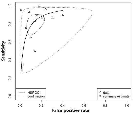 - Reitsma, J.B.; Glas, A.S.; Rutjes, A.W.; Scholten, R.J.; Bossuyt, P.M.; Zwinderman, A.H. Bivariate analysis of sensitivity and specificity produces informative summary measures in diagnostic reviews. J. Clin. Epidemiol. 2005, 58, 982–990. [Google Scholar] [CrossRef]