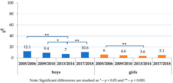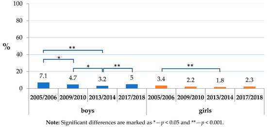 The co-occurrence of the above-mentioned factors, i.e., insufficient toothbrushing together with the daily consumption of sweets or sweetened soft drinks, was seen in less than one-tenth of the respondents (Figure 3). It showed a declining trend until 2013/2014. In 2017/2018, a repeated increase was observed, reaching statistical significance only in boys (from 1.8% to 2.3%).
