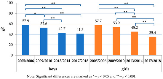 Almost six in 10 respondents reported in 2005/2006 the daily consumption of either sweets or sweetened soft drinks (Figure 2). A noticeable declining trend was shown both in boys and girls, leading to 41.3% and 35.4% in 2017/2018, respectively.
