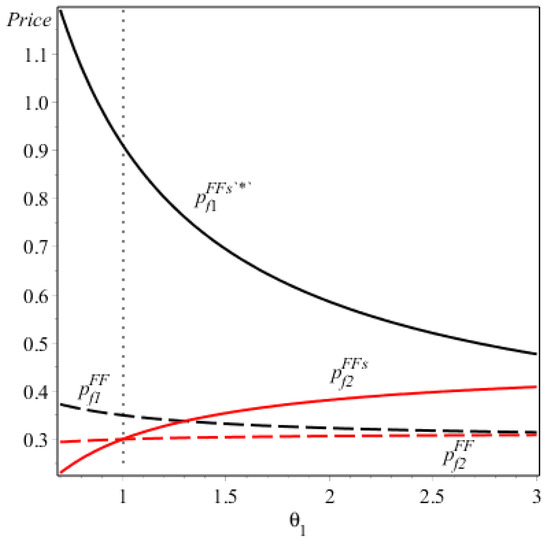 Corollary 3/(iv) (see Figure 2) shows the price comparison when firm 1 produces the FV and firm 2 produces the EV in . Because the EV is greener than the energy-saving FV, the consumer subsidy would enhance the competitive advantage of firm 2 relative to firm 1. Therefore, firm 2 will charge a higher price for the EV with the consumer subsidy, compared to that without the consumer subsidy. Moreover, instead of reducing the price, firm 1 will charge a higher price for the FV with the consumer subsidy only if its technology capacity is high enough under which it could offer a sufficiently high energy-saving level of FV to retain its potential consumers.