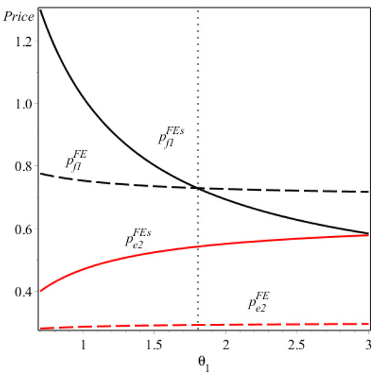 Corollary 1/(i) shows that if a firm’s technology capacity for improving the energy-saving level of the FV is higher (i.e., as or decreases), the firm will increase the price for the FV. This result is counter-intuitive. Usually, a higher technology capacity means a lower variable manufacturing cost, so the firm should charge a lower price for the FV. However, as the firm’s technology capacity increases (i.e., as or decreases), the firm is willing to make more environmental effort (i.e., , ), which increases the cost for improving the energy-saving level of FV. Thereby, the firm will increase the price for the FV. In addition, the threshold for a firm engaging in producing the EV is independent of the other firm’s technology capacity and decreases in its own technology capacity. This fact implies that a higher technology capacity for improving the technology capacity will reduce the firm’s willingness to produce the EV.
