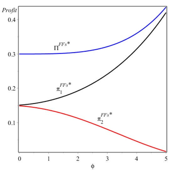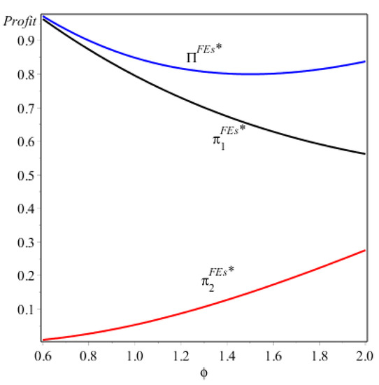 As Proposition 3/(i) shows (see Figure 3), when firm 1 and 2 both provide FVs, the profit of firm 1 would increase and that of firm 2 would decrease as the consumer subsidy increases. The opposite effects of on the two firms could be attributed to the competition between them. When the two firms both offer energy-saving FVs, firm 1 would offer higher energy-saving levels than firm 2. Obviously, a consumer could get more subsidies from purchasing the energy-saving FV of firm 1 than from purchasing that of firm 2. Therefore, as the consumer subsidy rises, firm 1 would gain more competitive advantages than firm 2, which largely reduces the sales of firm 2. Firm 2 would lose more profits as its sales decrease. In particular, the whole profits (i.e., ) are improved under the consumer subsidy program, which implies that the consumer subsidy could take more gains of profits to firm 1 relative to the loss of profits to firm 2 when the two firms both offer the FVs.