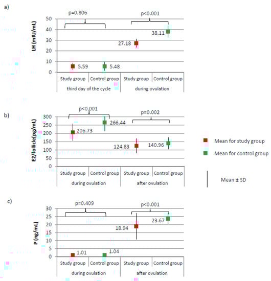 During the process of verification of study group participants, the interview method was used. Only women with a diagnosis of primary infertility (who were not previously pregnant) were qualified for the study, and according to the WHO definition of infertility [], 1 year of regular efforts to achieve pregnancy has passed. Only women who first entered for infertility therapy, had not previously received hormone treatment, and their fallopian tubes were patent could be qualified as a participant. This type of infertility is classified as of unexplained etiology. The parameters of sperm of their partners met the WHO 2010 standards [], which excluded male infertility. For the first 3 months after being diagnosed with infertility, women in the study group had their menstrual cycles monitored and naturally tried to become pregnant after the detection of an LH surge. In this study, the result of the first analyzed menstrual cycle is presented.