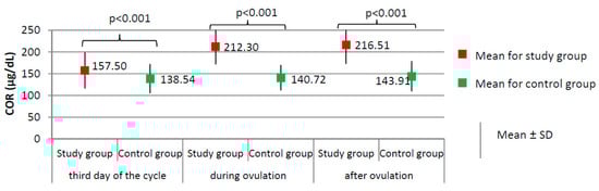 Women from the study group had significantly higher levels of cortisol at each phase of the menstrual cycle than did the women from the control group (p < 0.001, Figure 2), and higher prolactin levels on the third day of the cycle (24.75 ± 10.68 versus 17.78 ± 6.72 ng/dL; p < 0.001). No significant difference between the study group and the control group was found according to the levels of TSH on the third day of the cycle (1.76 ± 0.33 versus 1.71 ± 0.43 µIU/mL; p = 0.303).