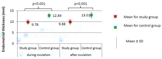 Imaging tests did not show any significant differences with respect to the day of ovulation (12.41 ± 2.13 for study group versus 12.83 ± 1.54 for control group, p = 0.077) or the follicle size at ovulation (1.86 ± 0.20 for study group versus 1.90 ± 0.25 cm, p = 0.144). The percentage of women from the study group in whom the follicle ruptured (N = 189, 94.5%) did not significantly differ from the percentage in the control group (N = 96, 96.0%) (χ2 = 0.316; p = 0.574). Women from the study group had a significantly thinner endometrium than those in the control group, both during ovulation (9.78 versus 12.84 mm) and after ovulation (9.88 versus 13.01 mm; p < 0.001, Figure 3).