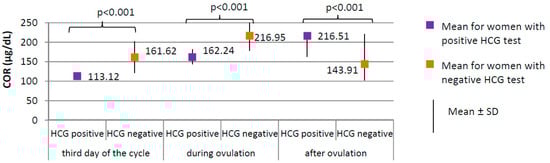 Women with positive HCG test, compared to those with negative HCG test, were characterized by a significantly lower level of cortisol at each phase of the cycle (p < 0.001; third day of the cycle 113.12 versus 161.62 µg/dL; during ovulation 162.24 versus 216.95 µg/dL; after ovulation 163.18 versus 221.46 µg/dL, respectively, Figure 4) and lower prolactin level on the third day of the cycle (18.31 ± 8.14 versus 25.35 ± 10.70 ng/mL, respectively; p = 0.009). No difference between groups was found in the levels of TSH on the third day of the cycle (1.59 ± 0.60 μIU/mL for women with positive HCG test versus 1.78 ± 0.29 μIU/mL for women with negative HCG test, p = 0.823).