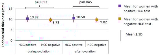 The percentage of women with positive HCG test in whom the follicle ruptured (100.0%) did not significantly differ from women with negative HCG test in whom the follicle ruptured (183, i.e., 94.0%), (χ2 = 1.081; p = 0.298). Ovulation occurred on day 13, on average, in women with positive HCG test and on day 12 in women with negative HCG test (p = 0.064). The follicle size did not significantly differ between women with positive HCG test (1.87 ± 0.27 cm on average) and women with negative HCG test (1.86 ± 0.19 cm on average), (p = 0.775). No significant differences in endometrial thickness were observed during ovulation; however, the difference in endometrial thickness after ovulation was significant (p = 0.045; 10.58 mm) in women with positive HCG test versus 9.82 mm in women with negative HCG test (Figure 5).