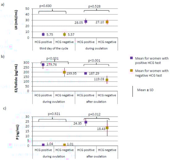 No differences between women with positive and negative HCG test were found in the levels of AMH and FSH on the third day of the cycle. AMH level was on average 2.19 ± 0.52 for women with positive HCG test versus 2.49 ± 0.73 ng/mL for women with negative HCG test, p = 0.122. FSH level was on average 6.66 ± 1.97 for women with positive HCG test versus 6.24 ± 1.86 mIU/mL for women with negative HCG test, p = 0.348. LH on the third day, or during ovulation (Figure 6a) or progesterone level during ovulation (Figure 6c) did not significantly differ between women with positive and negative HCG tests. Women with positive HCG test, compared to those with negative HCG test, were characterized by a significantly higher estradiol level both during ovulation (p < 0.001; 279.76 versus 199.95 pg/mL) and after ovulation (187.29 versus 119.03 pg/mL), as well as a higher progesterone level after ovulation (p = 0.012; 24.35 versus 18.43 ng/mL) (Figure 6b,c).