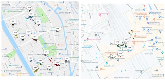 The map on the left shows individual survey participants who consumed snacks at home. The map on the right shows the GPS cluster in a 300 m radius centered on Utrecht Central Station, which includes at least four unique participants.