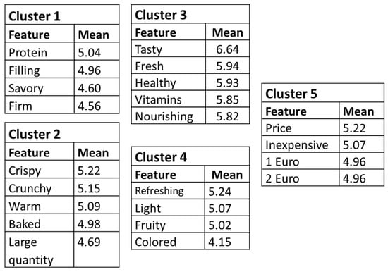 Figure 2 lists only those features rated 4 or higher, since features with a lower rating implied insufficient agreement on the importance of this feature among the participants []. Clusters 1–4 involve sensory and health-related characteristics, whereas Cluster 5 concerns price-related features. The five highest rated features are “tasty”, “fresh”, “healthy”, “vitamins”, and “nutritious”, all of which belong to Cluster 3. In our earlier study on people’s associations with an ideal snack, we also found that participants (N = 1087) rated the feature “healthy” among the top five, alongside features related to sensory characteristics such as “warm”, “sweet”, “cold”, and “savory” []. It thus seems that people have idiosyncratic ideas about the sensory characteristics of their ideal snack, though “healthy” appears to be a common feature, and we tried to take these different tastes into account when developing our healthy version of an ideal snack. Since “price” was also rated as important, forming its own cluster of features, we also made sure that the snack price was appropriate to the selling location (see Phase 3).