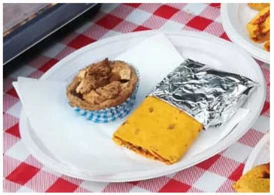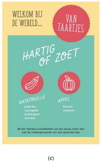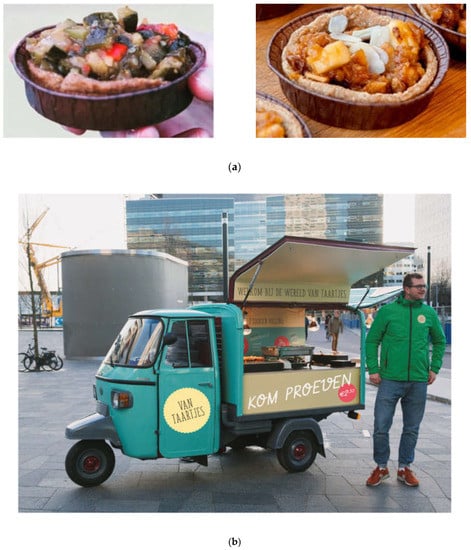 Therefore, for the final version of the snack we created a savory vegetable version of a pie snack that resembled the apple and raisin pie. Please see Figure 4a for a picture of both versions. The two final pie snacks were thus the apple and raisin pie and a pie with a vegetable (ratatouille) filling without any added sugar or salt in the filling. The pie crust was made from wholegrain wheat flour, egg, plant-based butter, water, and a pinch of salt. With these two pies, we were able to offer people the choice between a savory and a sweet snack, thereby catering to the individualistic snack preferences indicated in the concept mapping study and the “ideal snack” association study []. Appendix A presents the full ingredients of the pies. Together with the food designers, we then created the brand “Van Taartjes” (“Little Pies”) for the field experiment, with a correspondingly styled menu board and clothing for the sales staff. Please see Figure 4b,c for pictures of the food truck and the corresponding branding.