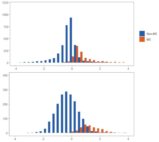 MS and MS severity score distribution for men (upper panel) and women (lower panel).