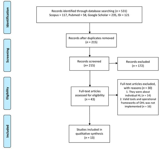 | Outcomes | Publication discusses at least one of the following issues: Studies that have examined OHL in terms of tool creation, development, and validation, or completed OHL standard tools in the environment, or studied OHL formation, implementation, and evaluation, and examined OHL barriers, facilitators, and outcomes in practice. | Articles not meeting the above criteria were excluded. |