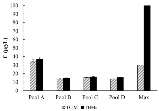 - Lee, J.; Ha, K.T.; Zoh, K.D. Characteristic of trihalomethane (THM) production and associated health risk assessment in swimming pool waters treated with different disinfection methods. Sci. Total Environ. 2009, 407, 1990–1997. [Google Scholar] [CrossRef] [PubMed]