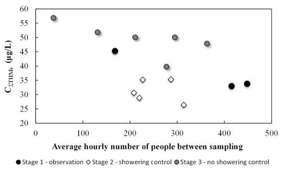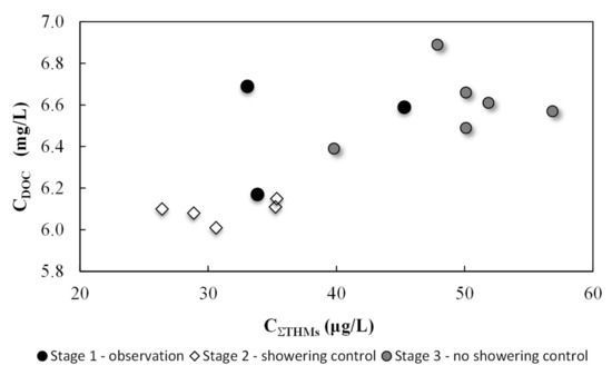 It should be expected that in the 3rd stage of the experiment, in which showering was not controlled, the obtained results concerning the concentration of DOC and THM should be between those obtained in the 1st and 2nd stage of the experiment. However, the THM concentrations were higher than those in stage 1. It could have been caused by the introduction of a significantly higher load of organic substances into the water than in stage 2, which could have resulted in an increased concentration of THMs. The THMs concentration is influenced, apart from the DOC concentration, by other factors, including the temperature of the water, which was slightly higher in stage 3.