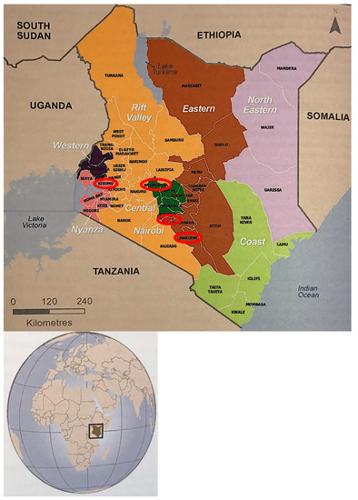 - Kenya National Bureau of Statistics and ICF Macro. Kenya Demographic Health Survey 2013–14; KNBS and ICF Macro: Calverton, MD, USA, 2015. [Google Scholar]