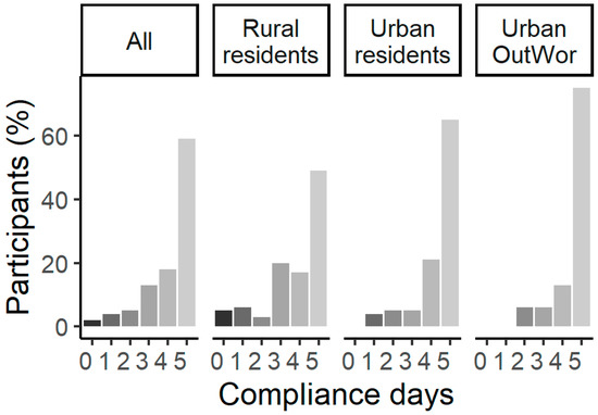 Intervention compliance days of participants. Participants (%) = number of participants/total participants × 100% in each compliance days category. Compliance days were days that participants carried out the intervention on Days 3–7 in the study. Pearson’s Chi-square tests showed the that there was significant difference in the distribution of compliance of person-days between Rural residents and Urban residents (Chi-Square = 7.99, Degrees of Freedom = 3, p-value = 0.046), but no significant difference between Urban residents and Urban OutWor (Chi-Square = 3.29, Degrees of Freedom = 3, p-value = 0.35).
