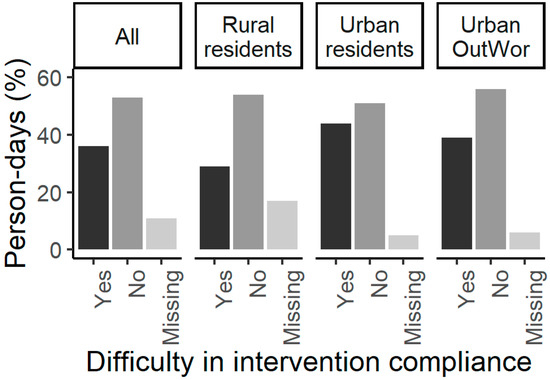 Person-days with self-reported compliance difficulty. Missing = participant did not report if she had difficulty in complying the intervention on a person-day. Pearson’s Chi-squared test showed that there was significant difference in the binary outcome of reported difficulty between Rural residents and Urban residents (Chi-Square = 8.83, Degrees of Freedom = 1, p-value = 0.003), and no significant difference between Urban residents and Urban OutWor (Chi-Square = 1.12, Degrees of Freedom = 1, p-value = 0.29).